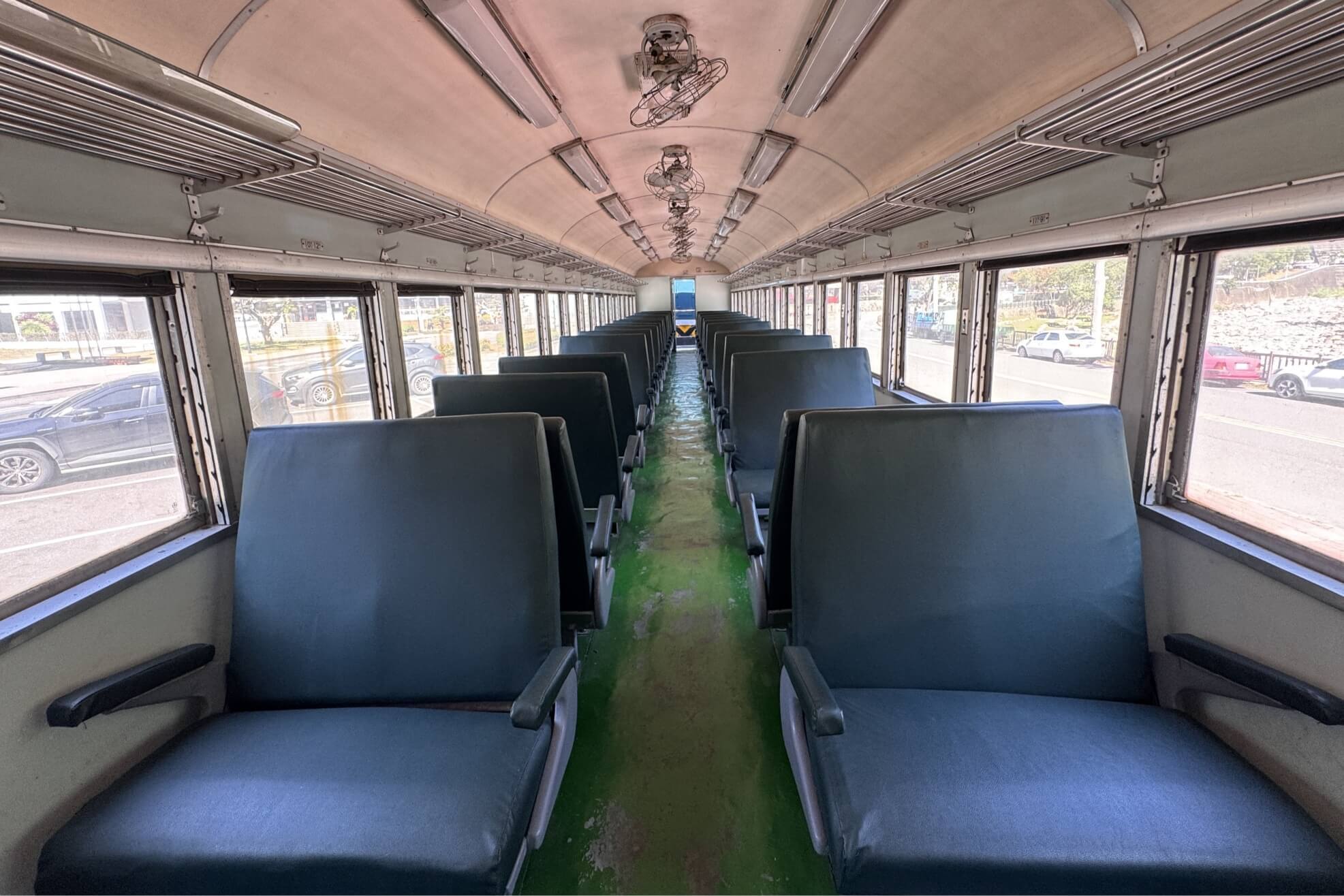 ↓車廂內保留著當年的雙人座大椅、手拉式玻璃窗、頭頂式電風扇,很令人懷念。藍皮普快車目前最常見的,是在『南迴線』服役的「藍皮解憂號」列車。