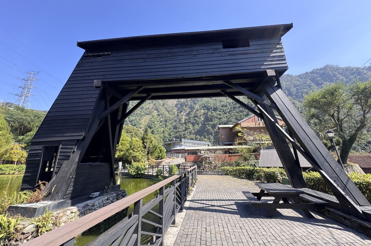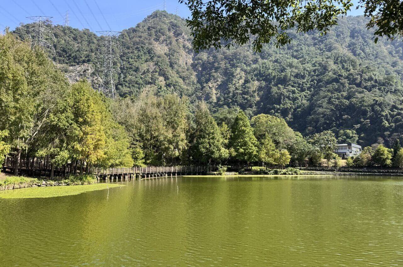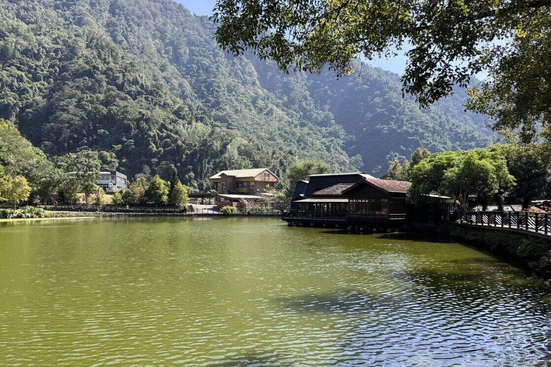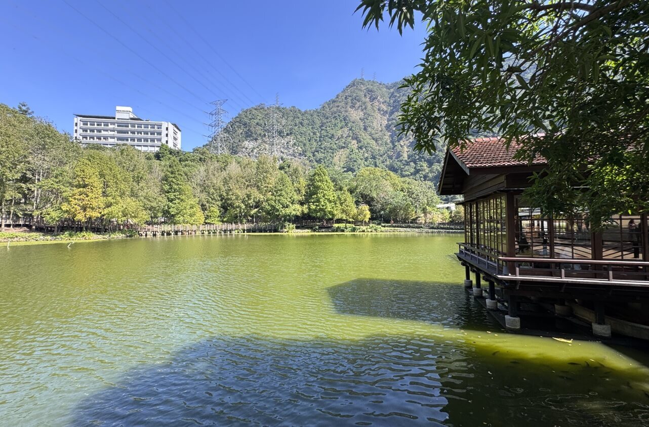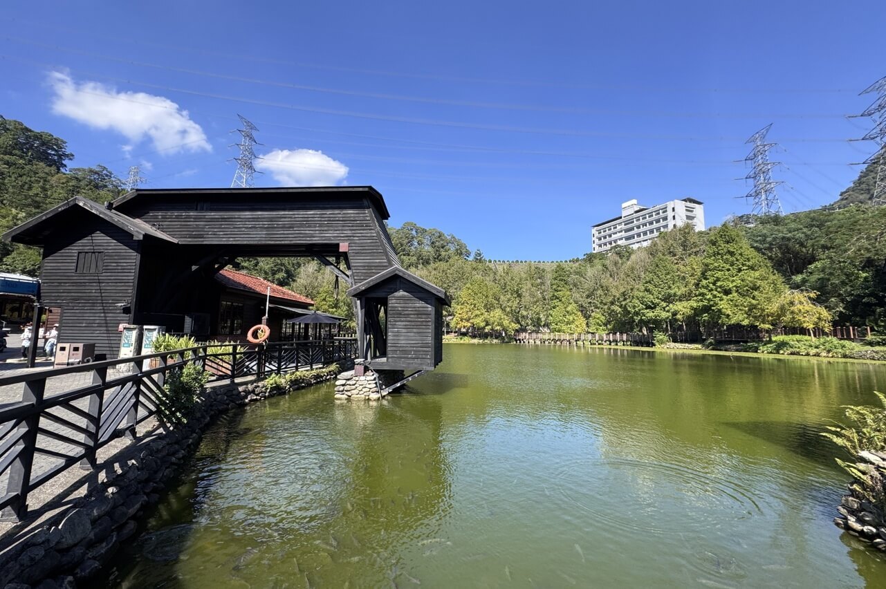 ↓貯木池呈現翠綠的顏色,不過並未看到任何的原木泡在水池上。右側這一間是日本時代就有的「茶屋」。