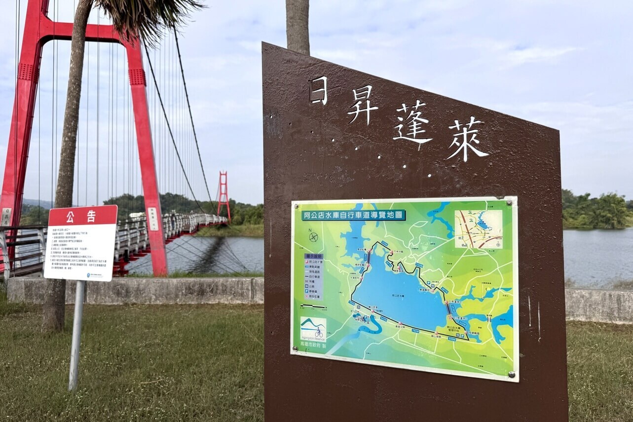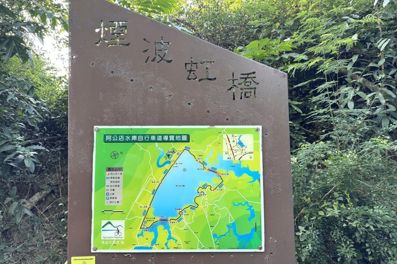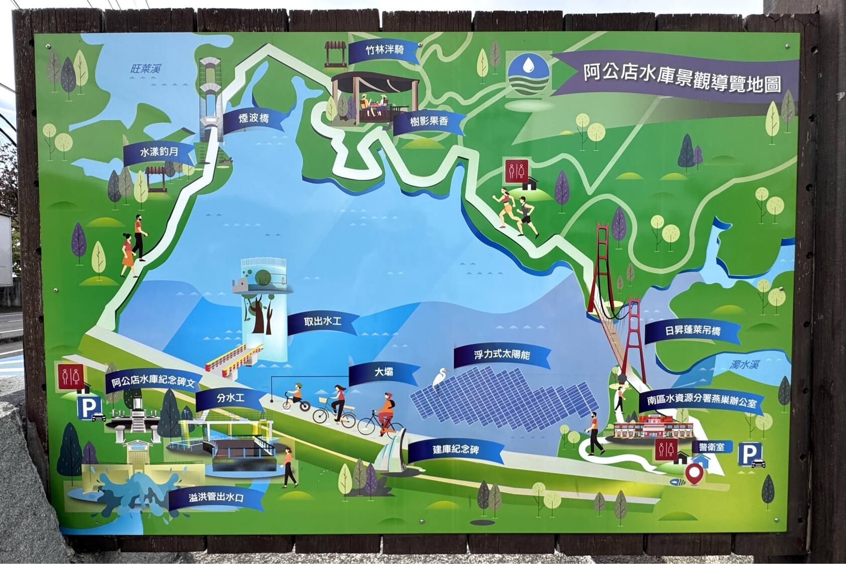 ↓阿公店水庫約略呈長方形,我們要從右下角的入口處出發,環繞水庫一圈。水庫有「日昇蓬萊吊橋」與「煙波橋」兩座橋,左下角一長條為大壩。環湖步道上,有『阿公店水庫十大景點』。