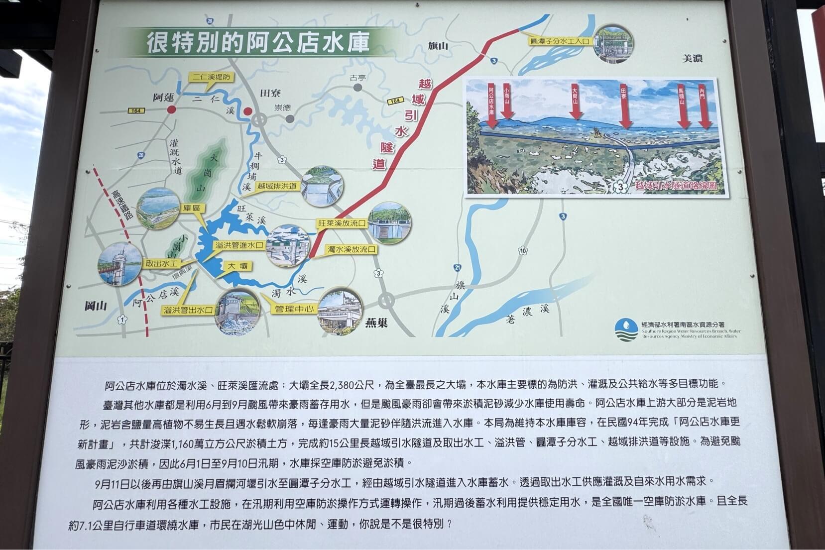 ↓阿公店水庫是一座很特別的水庫,位於「濁水溪」與「旺萊溪」的匯流處,而且從「旗山溪」透過「越域引水隧道」,進入「濁水溪」,再匯入水庫。