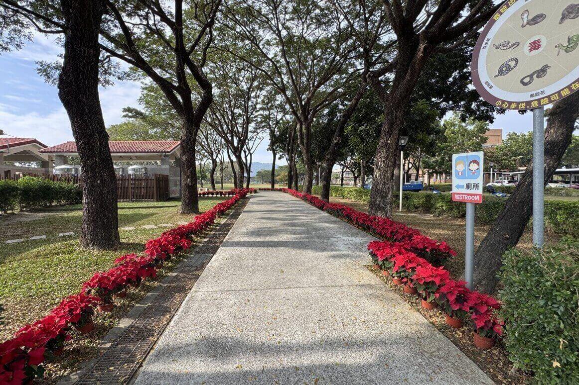 ↓進了大門,左側除了有廁所外,還有一片樹林。聖誕節快到了,沿途擺滿了聖誕紅。