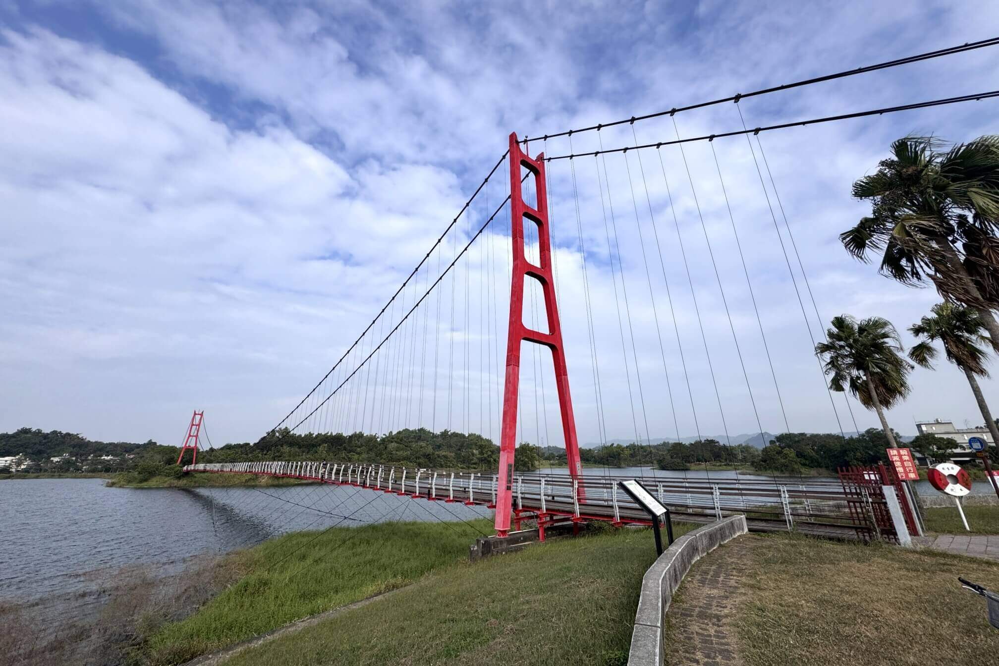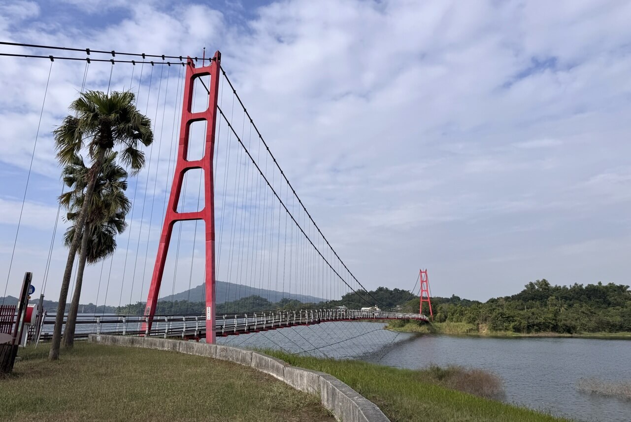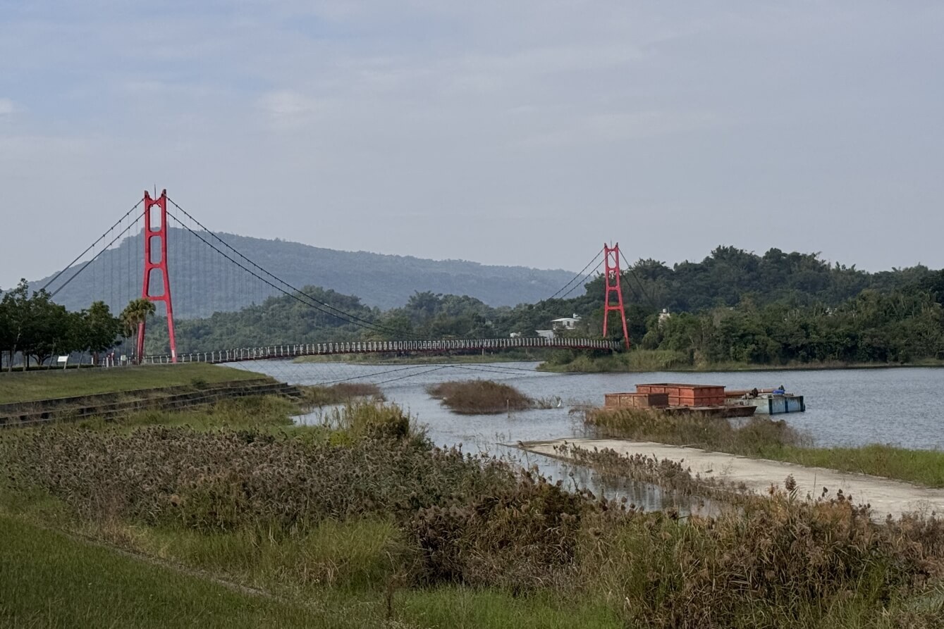 ↓日昇蓬萊吊橋是一座紅色雙塔式吊橋,長224公尺。