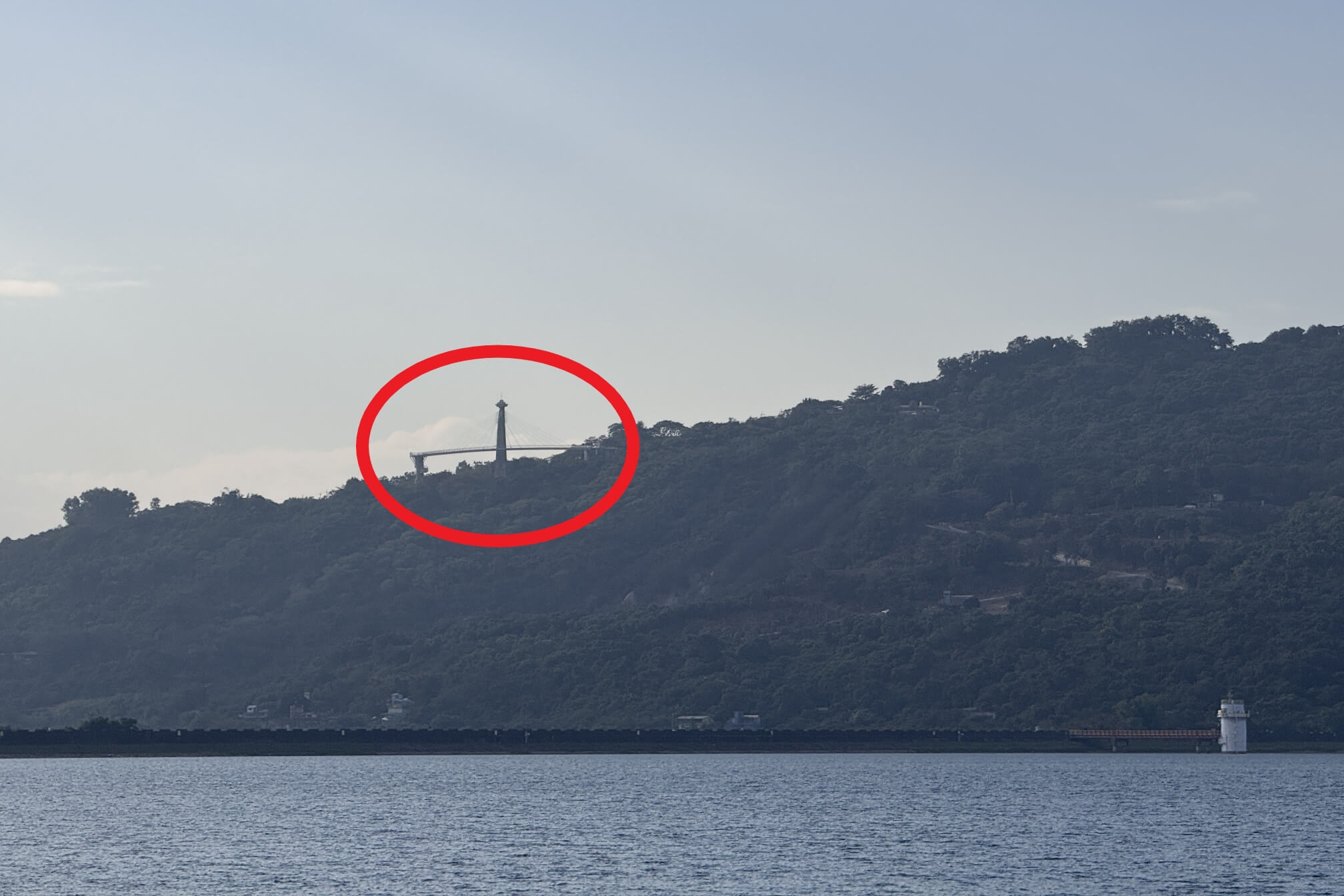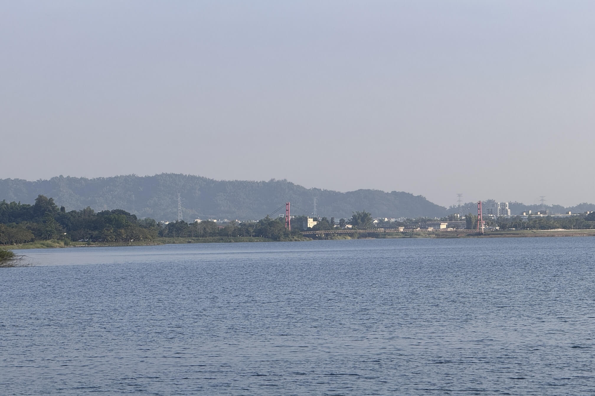 ↓從橋上望見遠山,依地理位置推測,左側近些的山應為「小崗山」,右側遠些的山應為「大崗山」。