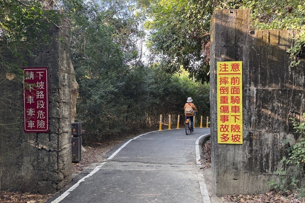 ↓碰到一處險降坡,有警示牌,老婆太慢注意,當欲下車牽車而行時,車子還有速度而摔了一大跤,手腳破皮(回到管理中心時有擦藥),為此行留下驚悚的記憶。