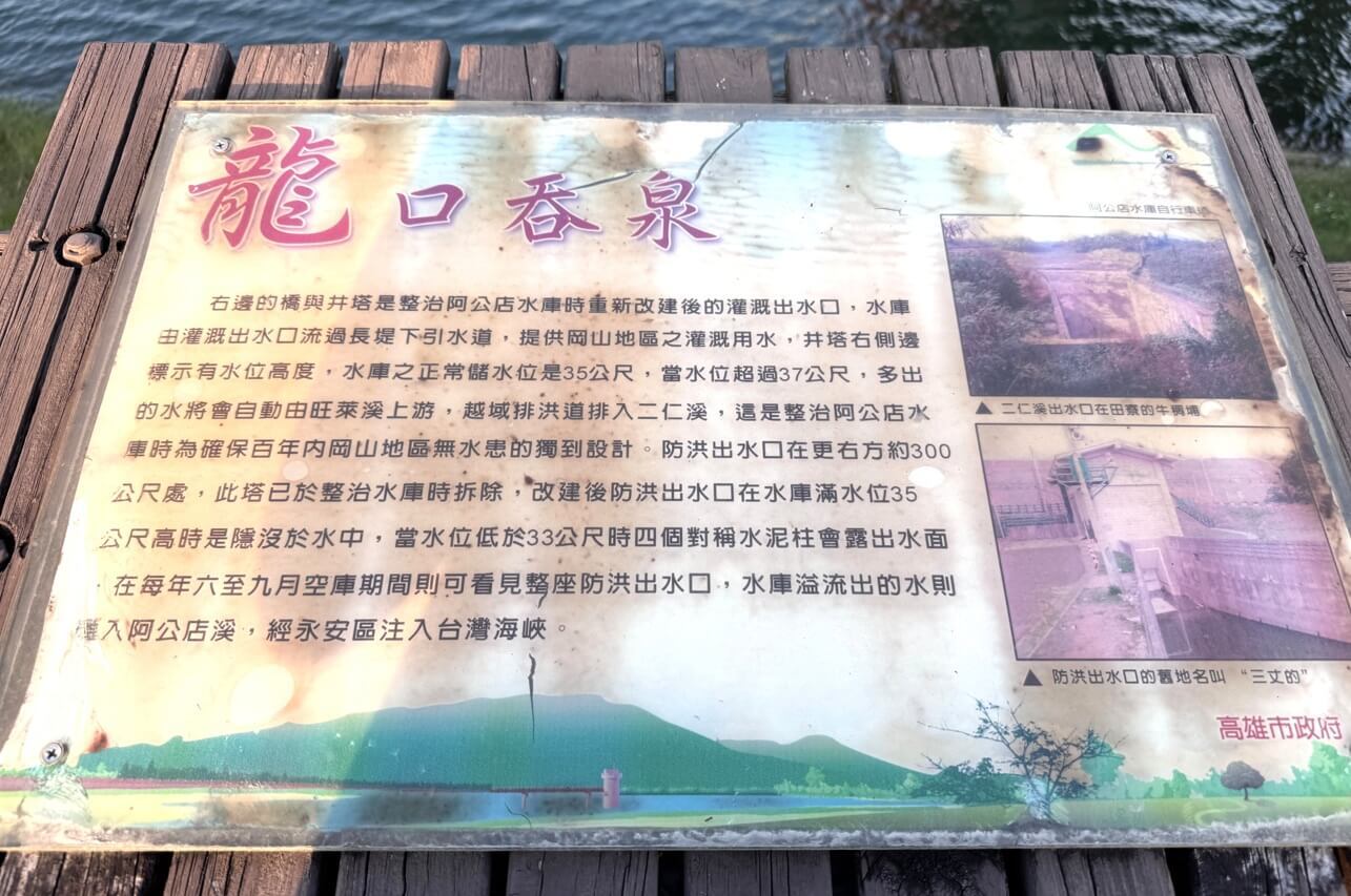 ↓這是大門,阿公店水庫目前參觀免門票。阿公店水庫從日本時代的1942年開始興建,因遭洪水破壞而中止;光復後續建,於1953年才竣工,成為全台施工時間(11年)最久,卻反而成為光復後最早建造完成的水庫。