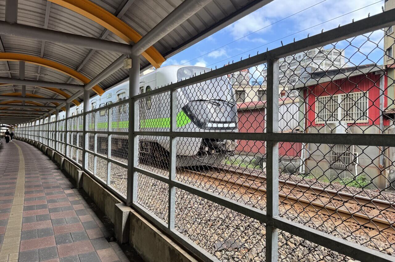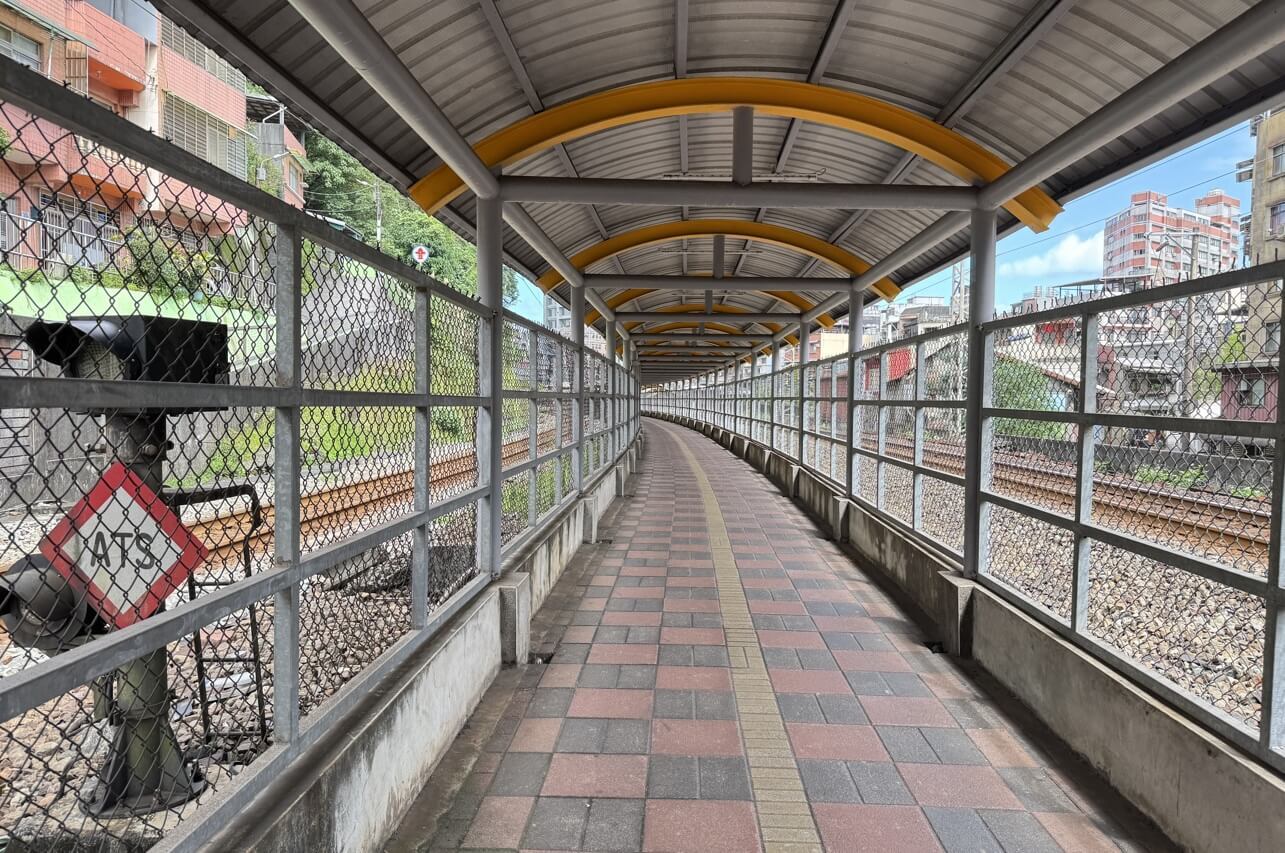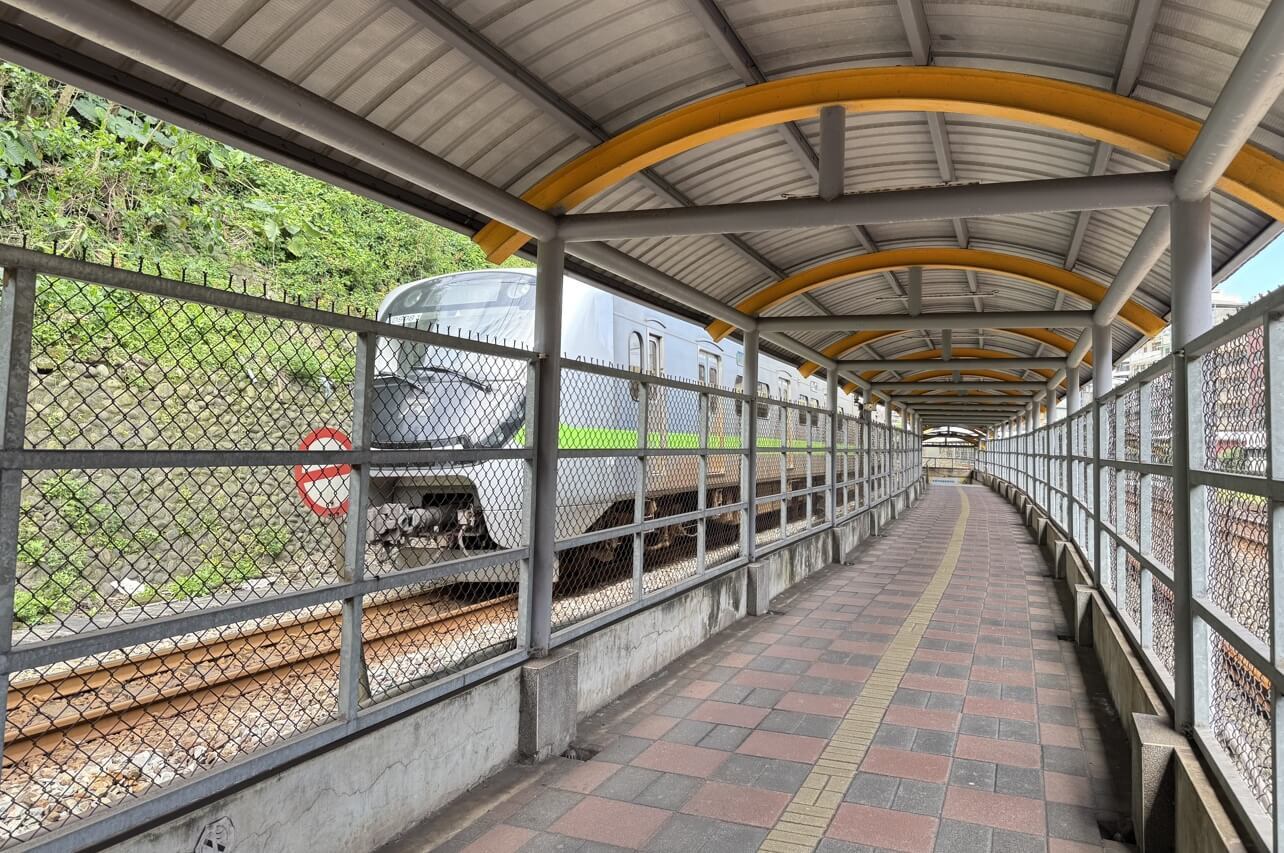 ↓三坑車站風雨走廊是一條旅客友善通道,左右兩側是南下北上的兩條鐵軌,旅客走在通道內,可以免去風吹、雨打、日曬之苦。
