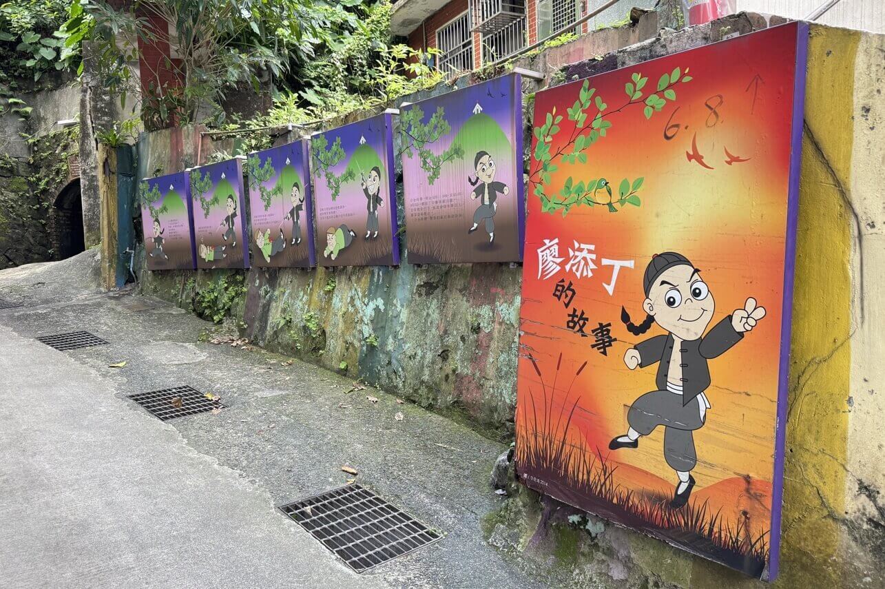 ↓這裡有一排有關傳奇人物廖添丁的故事。明治42年(1909年),廖添丁在犯下多起竊盜案後,遭日警重金懸賞,後來在基隆龍安街一帶與警民發生激烈戰鬥,廖添丁身手矯健、神出鬼沒,成功在數百名日警的嚴密搜索下脫逃。