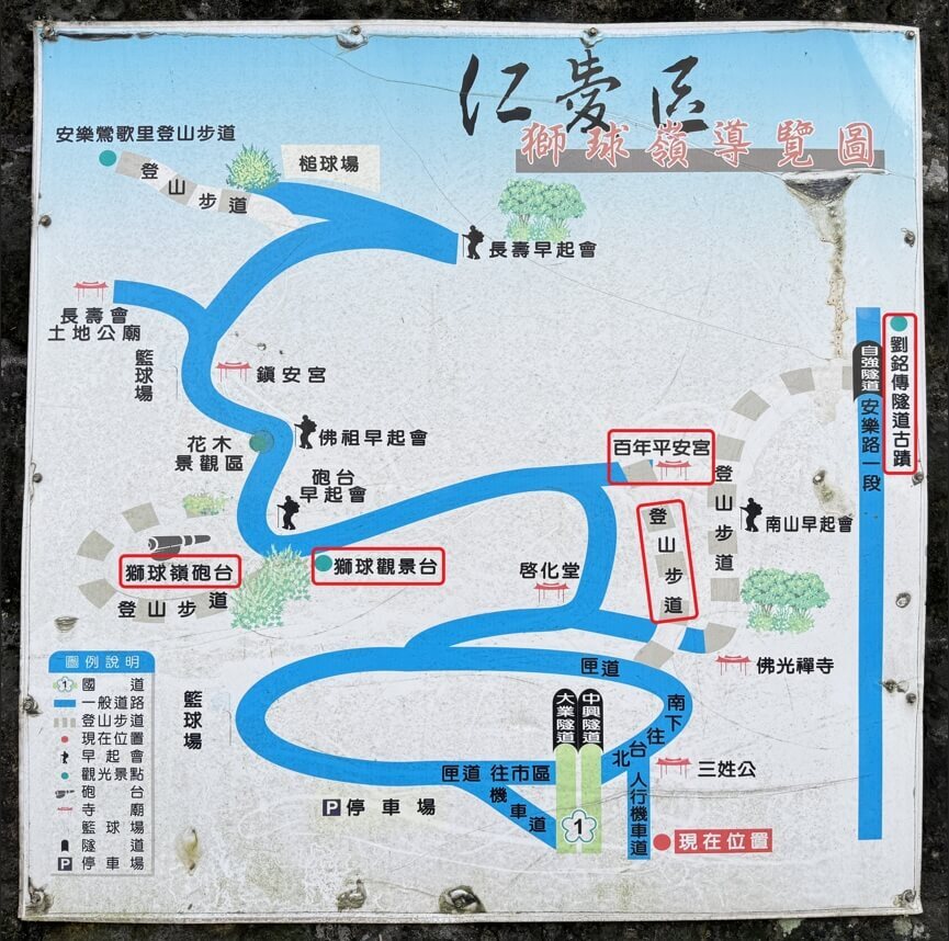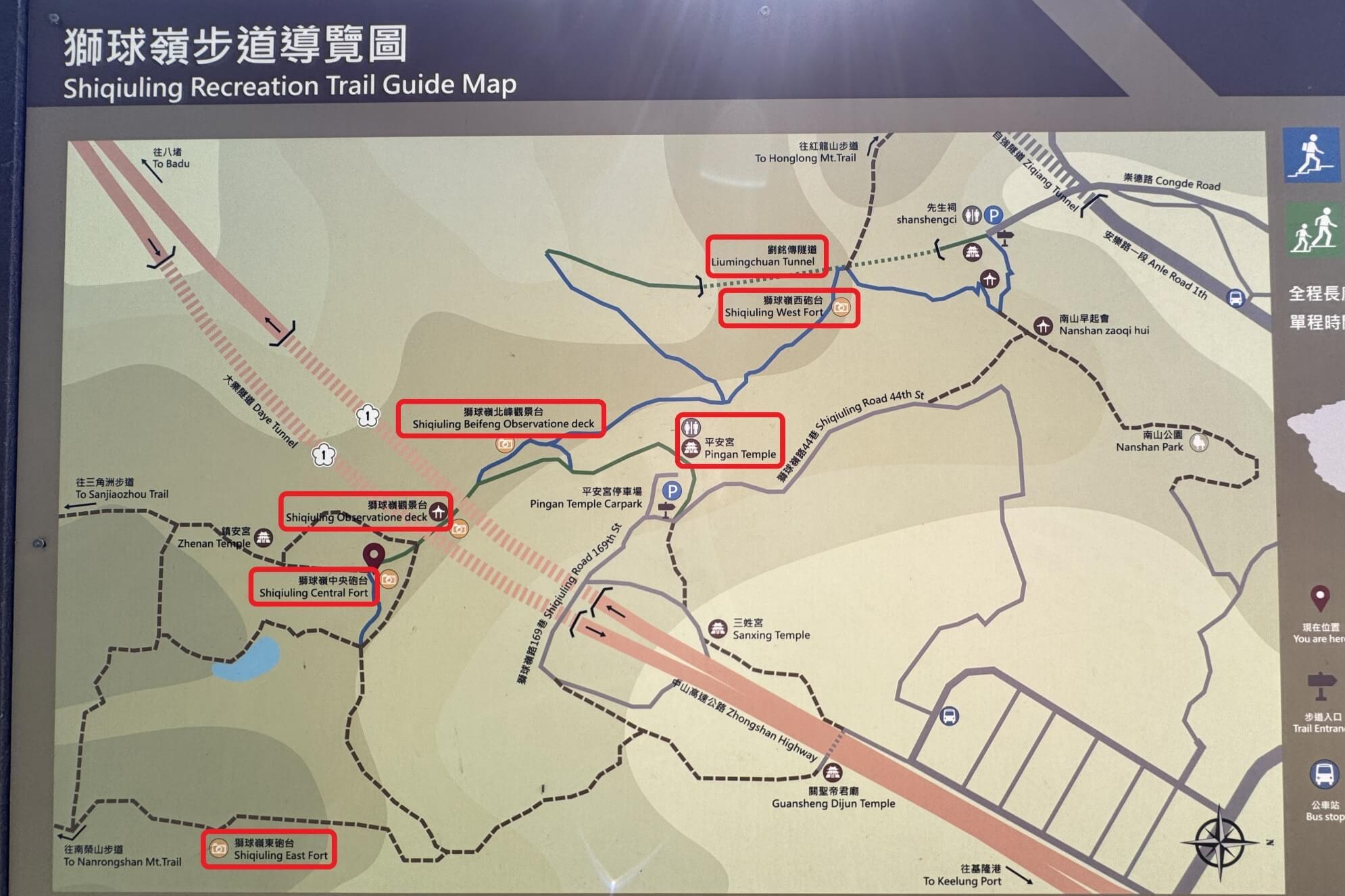 ↓我們從地圖的最下方開始走,將先走一段登山步道,到百年平安宮;接著往左行,到獅球嶺觀景台及獅球嶺砲台;而後原路折返,再走另一段登山步道,到地圖最右側的劉銘傳隧道古蹟。