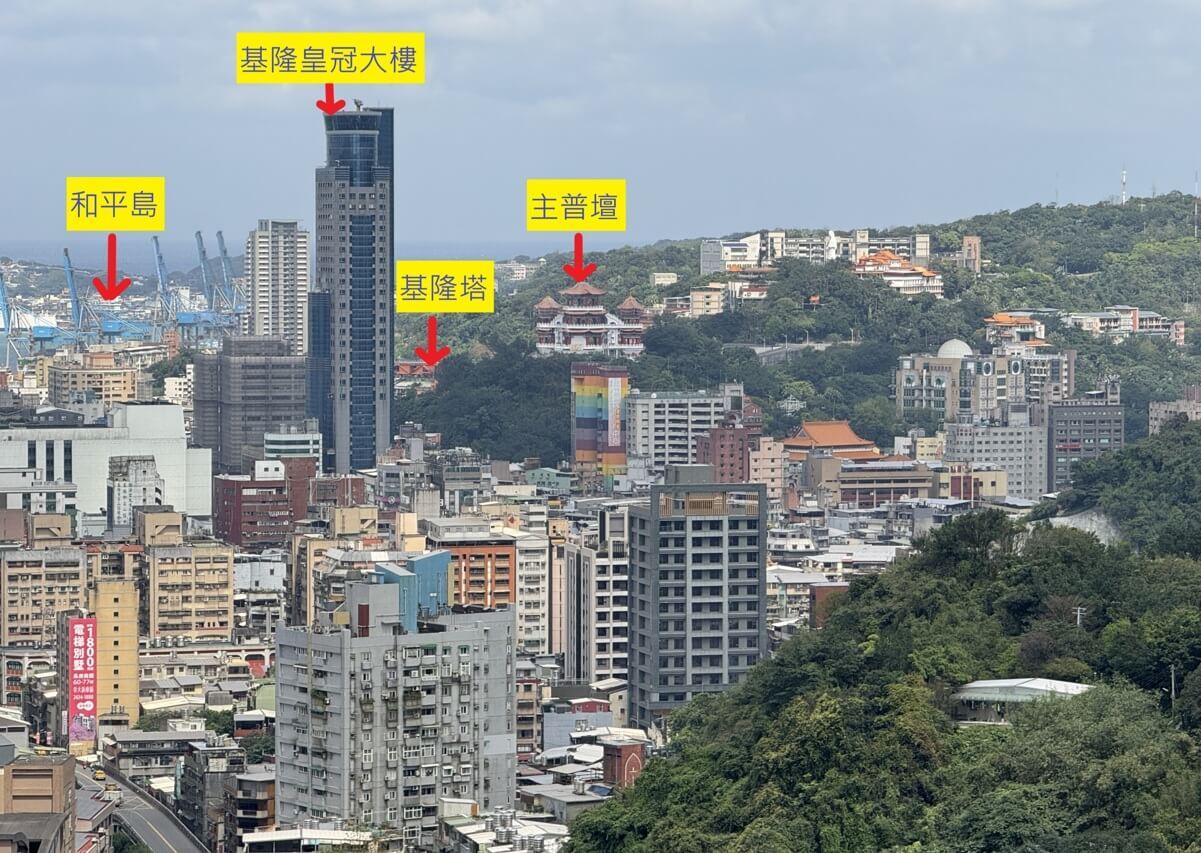 ↓先往右看,目前基隆市最高的地標「基隆皇冠商業大樓」、旁邊是這幾年的人氣景點「基隆塔」、基隆中元祭的普渡地點「主普壇」,還有稍遠處的「和平島」。