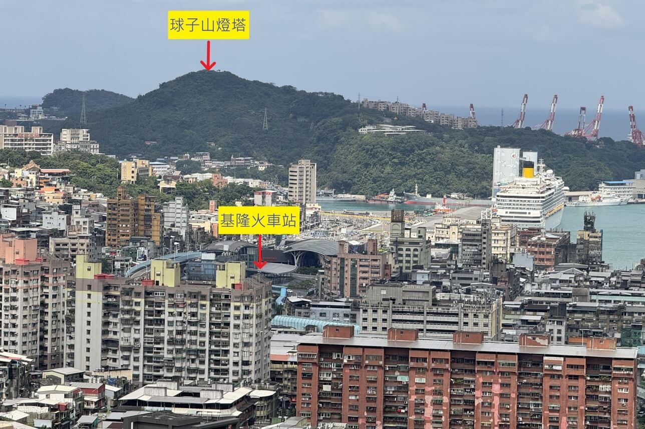↓往左看,正中間是「基隆火車站」及「基隆轉運站」;遠方山頭,有山友喜歡走的『基隆一日雙塔』之一的「球子山燈塔」。