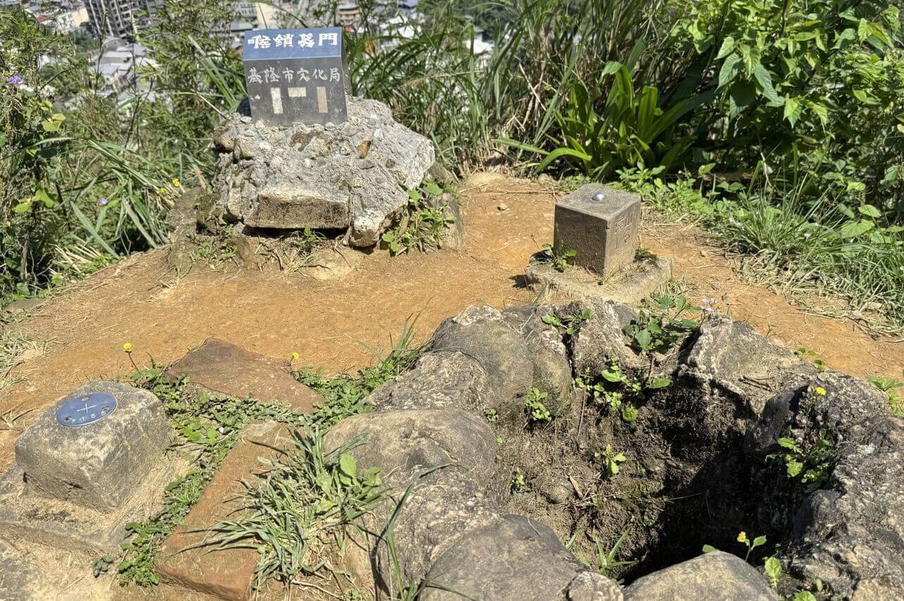 ↓爬上碉堡,看到一處像是碉堡的通風口的井狀凹陷;旁邊有兩座三角點,還有一座「喉鎖島門」的石碑,顯示獅球嶺扼守基隆港及北台灣門戶的重要性。