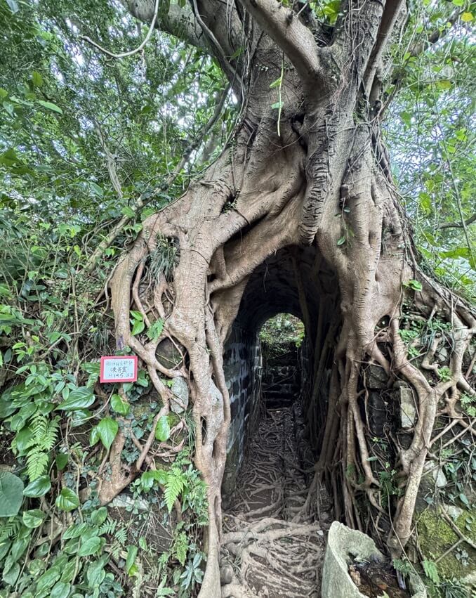 ↓一爬上來,馬上可以看到「獅球嶺東砲台」的碉堡,而且碉堡經年累月下,已被大榕樹所包覆,與台南安平的「樹屋」有一樣的巧妙風景。