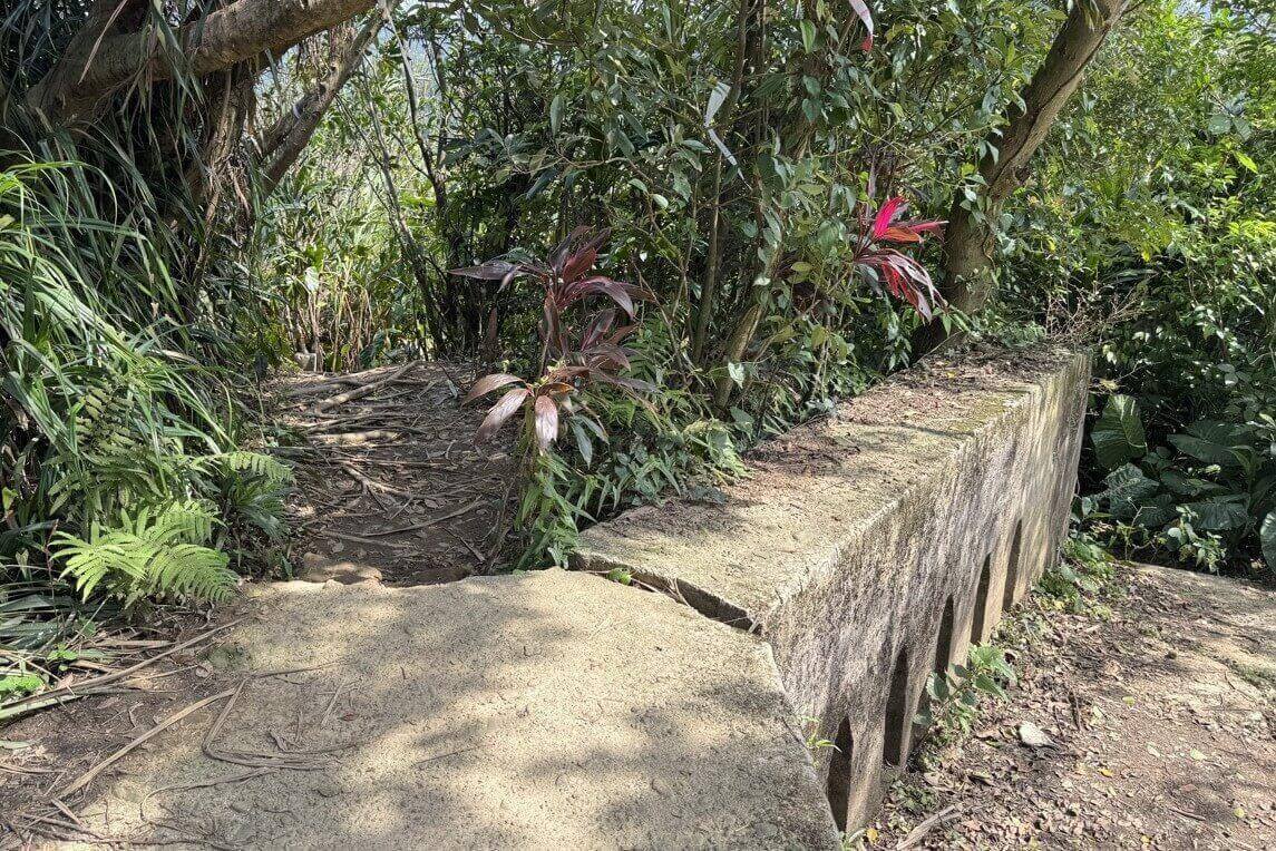 ↓約5分鐘,即來到「獅球嶺中央砲台」,遺跡上並無大砲或砲座,僅存砲軌,可以想像當年大砲對準外海的景象。