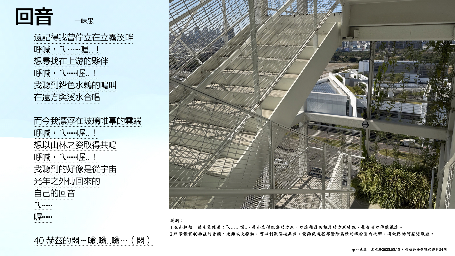 而今我漂浮在玻璃帷幕的雲端 呼喊,ㄟ⋯⋯喔..! 想以山林之姿取得共鳴 呼喊,ㄟ⋯⋯喔..! 我聽到的好像是從宇宙 光年之外傳回來的 自己的回音 ㄟ⋯⋯ 喔⋯⋯