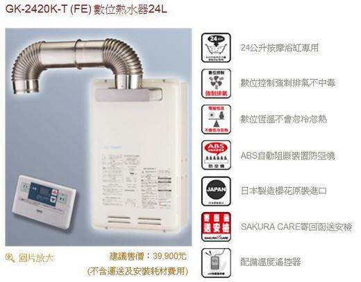 GK-2420K-T (FE)櫻花牌熱水器日本原裝數位恆溫強制排氣 24公升 產 地: 日本製造原裝進口 尺 寸: 高570mmX寬350mmX深165mm 點 火 方 式: 全自動電子點火 燃 氣 種 類: 液化瓦斯 / 天然瓦斯 使 用 電 壓: AC110V 熱水 出水量 : 24L/min (溫昇 25℃) 排氣設置方式: FE式 強制排氣 冷熱水管口徑: PF 3/4 排氣管口徑: 直徑15公分 排氣管挖孔尺寸:16公分