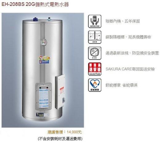 EH-208BS 櫻花牌電熱水器儲熱式不鏽鋼 20加侖 (20加侖 圓桶型) 機 體 尺 寸: 直徑40.0×高115.0 cm (直徑x高) 使 用 電 壓: AC220V 單相 功率 / 電流: 4KW / 18A 恆溫控制器: 50~80°C(出廠設定65°C) 高溫斷路器: 90 ±3°C 洩 壓 閥: 0.6MPa(6kg/cm2) 內 桶 耐 壓: 1.2MPa(12kg/cm2) 漏電斷路器: 2P20A 出 水 口: 上方 進、出水管口徑: 1/2英吋 按 裝 方 式: 落地型 外 觀 材 質: 不鏽鋼桶身 使 用 人 數: (20加侖76L) 3~5人