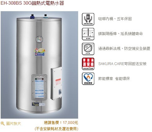 節能標章、省能環保 高效能30加侖 儲熱式 1.熱水隨時儲存(30加侖=114公升):再也不怕洗澡沒有熱水 2.通過最新法規、防空燒安全裝置 3.多重安全防護:安全防爆裝置,使用更安心 4.全效漏電保護:預防漏電沒煩惱 5.保固「五年」不漏水:適合各種水質,耐腐蝕不漏水 6.鎂製陽極棒電熱技術:高效儲熱,不再擔心瓦斯漲價「荷包不縮水」 7.高密度PU發泡琺瑯內桶:雙重保溫效果好,最省電 8.熱水不再忽冷忽熱,不怕高樓層強風 9.到府安裝 + 舊機拆除★可貨到付款★