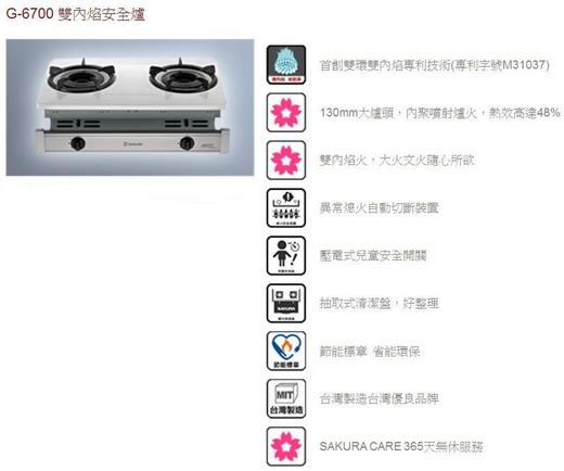 SG-6700 櫻花牌瓦斯爐雙環雙內焰 (嵌入爐)