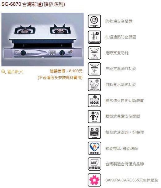 SG-6870 櫻花牌瓦斯爐防乾燒(微電腦定時+定溫+煮水) 節能