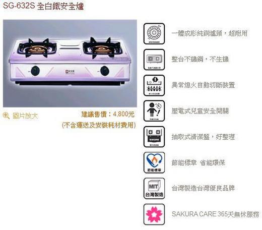 SG-632S 櫻花牌瓦斯爐整台不鏽鋼安全 (節能)