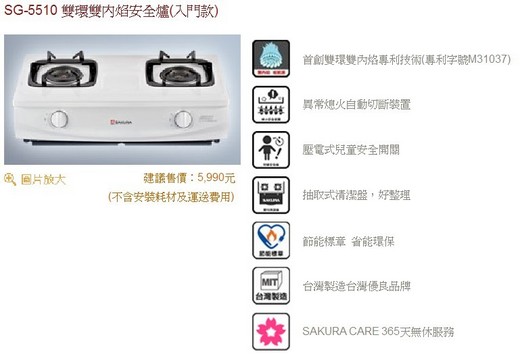 SG-5510 櫻花牌瓦斯爐雙環雙內焰高效安全爐 機體尺寸: 700×400×195mm (免挖孔) 機體重量: 淨重 11.5 kg 顏色材質: 白色琺瑯 / 不鏽鋼 面板 瓦斯種類: 天然瓦斯 / 桶裝瓦斯 點火方式: 壓電式左旋打擊點火 ~歡迎蒞店參觀選購! 安裝前注意事項: 1.瓦斯熱水器安裝需注意(屋外型或防風型熱水器)是否為通風良好無窗戶環境, 或(強制排氣型熱水器)是有窗戶及密閉空間。 2.強制排氣熱水器需要預留110V電壓及6.3公分的排氣管挖孔尺寸。 3.電能熱水器需要有220V電壓及冷熱水管線,需要注意電壓安培數是否足夠。 4.瓦斯爐需要注意:傳統式 瓦斯爐、崁入式 瓦斯爐、檯面式 瓦斯爐,需要 告知挖孔尺寸以利安裝。 5.排油煙機需要注意目前的機體寬度是多少,機體寬度通常為70、80、90公分。 6.烘碗機需要注意目前的機體寬度是多少:懸掛式60、80、90公分、 崁入式45、50、60公分尺寸以利安裝。