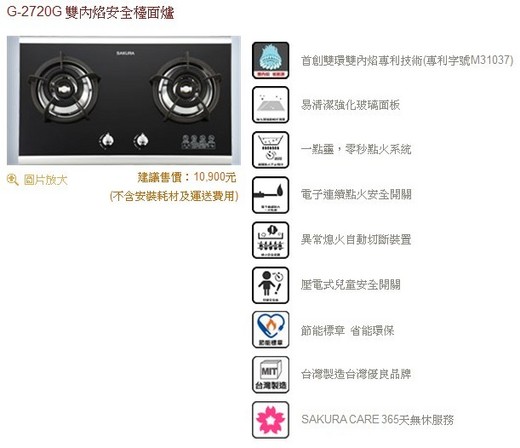 SG-2720G高效雙環雙內焰檯面爐 (最節能)送全省安裝★一家購買櫻花全省安裝、售後服務保證★爐火熄滅自動關火、關瓦斯,廚房安全最安心節能標章、省能環保1.首創雙環雙內焰專利技術(專利字號M31037)2.最節能30%、省時20%、省錢25% 節能標章3.內焰爐頭火力集中,熱效率更高4.煎、煮、炒、炸,最"青"的選擇5.異常熄火自動切斷裝置:爐火熄滅自動切斷瓦斯6.一點靈,電子連續點火開關:壓電式兒童安全開關7.電子連續點火安全開關:點火精確快速,料理烹調最美味8.易清潔強化玻璃面板:輕鬆擦拭好整理9.台灣製造台灣優良品牌:SAKURA CARE 365天無休服務10.瓦斯種類:天然瓦斯 或 桶裝瓦斯11.貨到付款+到府安裝(二口檯面爐) SG-2720G 櫻花牌瓦斯爐高效雙環雙內焰檯面爐 (最節能)機體尺寸: 730×460×130mm (需挖孔) 挖孔尺寸: 670×350mm R角30機體重量: 17.5 kg 顏色材質: 黑色強化玻璃瓦斯種類: 天然瓦斯 / 桶裝瓦斯點火方式: 電子連續點火開關
