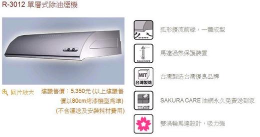 R-3012 櫻花牌排油煙機高效能 80公分