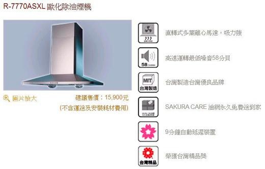 R-7770ASXL 櫻花牌排油煙機歐式漏斗型 90公分 機體尺寸: 寬890×深520×高595~976 mm 機體重量: 20 kg 使用電壓: AC110V 60Hz 消耗功率: 190W 排 風 量: 13 立方米/min 外觀材質: 不鏽鋼 開關型式: 觸控式 三速 ~歡迎蒞店參觀選購! 安裝前注意事項: 1.瓦斯熱水器安裝需注意(屋外型或防風型熱水器)是否為通風良好無窗戶環境, 或(強制排氣型熱水器)是有窗戶及密閉空間。 2.強制排氣熱水器需要預留110V電壓及6.3公分的排氣管挖孔尺寸。 3.電能熱水器需要有220V電壓及冷熱水管線,需要注意電壓安培數是否足夠。 4.瓦斯爐需要注意:傳統式 瓦斯爐、崁入式 瓦斯爐、檯面式 瓦斯爐,需要 告知挖孔尺寸以利安裝。 5.排油煙機需要注意目前的機體寬度是多少,機體寬度通常為70、80、90公分。 6.烘碗機需要注意目前的機體寬度是多少:懸掛式60、80、90公分、 崁入式45、50、60公分尺寸以利安裝。
