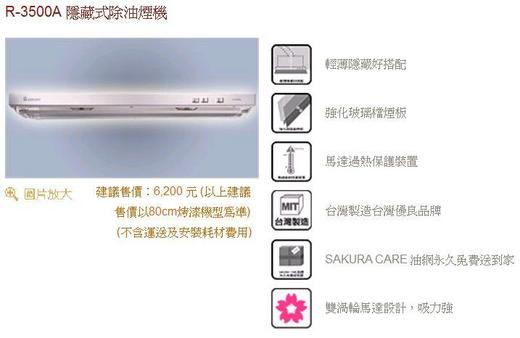 R-3500AXL 櫻花牌排油煙機歐式隱藏式 90公分 機體尺寸: 寬890×深370×高234mm 機體重量: 16 kg 使用電壓: AC110V 60Hz 消耗功率: 200W 排 風 量: 14 立方米/min 外觀材質: 白色琺瑯 開關型式: 翹板式開關 二段 ~歡迎蒞店參觀選購! 安裝前注意事項: 1.瓦斯熱水器安裝需注意(屋外型或防風型熱水器)是否為通風良好無窗戶環境, 或(強制排氣型熱水器)是有窗戶及密閉空間。 2.強制排氣熱水器需要預留110V電壓及6.3公分的排氣管挖孔尺寸。 3.電能熱水器需要有220V電壓及冷熱水管線,需要注意電壓安培數是否足夠。 4.瓦斯爐需要注意:傳統式 瓦斯爐、崁入式 瓦斯爐、檯面式 瓦斯爐,需要 告知挖孔尺寸以利安裝。 5.排油煙機需要注意目前的機體寬度是多少,機體寬度通常為70、80、90公分。 6.烘碗機需要注意目前的機體寬度是多少:懸掛式60、80、90公分、 崁入式45、50、60公分尺寸以利安裝。