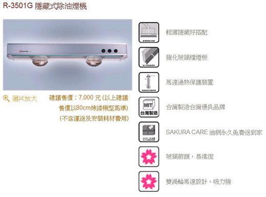2.強化玻璃檔煙板:搭配整體廚房高雅大方。 3.玻璃面板:易清潔不易沾油、擦拭容易好清潔。 4.強效雙渦輪馬達:運轉平順,廚房更安靜。 5.馬達過熱保護裝置(溫度超過106℃自動斷電)。 6.奈米塗佈鋼網:表面不卡油清洗沒煩惱。 7.鋼網撥板旋鈕設計:好拆裝更Easy。 8.符合CNS3765 & EMC標準規定。 9.可貨到付款+到府安裝。 R-3501GL 櫻花牌排油煙機歐式隱藏式 80公分 機體尺寸: 寬795×深380×高180mm 機體重量: 13 kg 使用電壓: AC110V 60Hz 消耗功率: 160W 排 風 量: 16 立方米/min 外觀材質: 白色琺瑯、玻璃面板 開關型式: 翹板式開關 二段