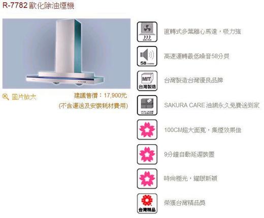 R-7782SHXL 櫻花牌排油煙機歐式雙層T型 100公分橘光 機體尺寸: 寬900×深500×高595~970 mm 機體重量: 22 kg 使用電壓: AC110V 60Hz 消耗功率: 190W 排 風 量: 13 立方米/min 外觀材質: (橘色) 不鏽鋼 開關型式: 觸控式 三速 ~歡迎蒞店參觀選購! 安裝前注意事項: 1.瓦斯熱水器安裝需注意(屋外型或防風型熱水器)是否為通風良好無窗戶環境, 或(強制排氣型熱水器)是有窗戶及密閉空間。 2.強制排氣熱水器需要預留110V電壓及6.3公分的排氣管挖孔尺寸。 3.電能熱水器需要有220V電壓及冷熱水管線,需要注意電壓安培數是否足夠。 4.瓦斯爐需要注意:傳統式 瓦斯爐、崁入式 瓦斯爐、檯面式 瓦斯爐,需要 告知挖孔尺寸以利安裝。 5.排油煙機需要注意目前的機體寬度是多少,機體寬度通常為70、80、90公分。 6.烘碗機需要注意目前的機體寬度是多少:懸掛式60、80、90公分、 崁入式45、50、60公分尺寸以利安裝。