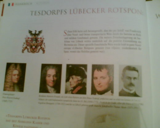 有可能嗎?本來不可能,自從幾年前,參加呂北克的泰斯多夫美酒俱樂部之後,不可能變成可能。 泰斯多夫美酒俱樂部創于1678年,專門收購各地美酒,以供懶得旅行的嗜酒之徒享用。看其VIP會員排行榜,即可一見端倪,如圖左起:伏爾泰〔有點耳熟吧〕,德意志帝國的腓特烈大帝〔名號嚇死人〕,拿破崙〔沒錯,就是那個名叫邦那巴提的小個子〕,湯瑪斯曼〔誰?提個醒,就是和龍姑乾杯的湯瑪斯曼〕。 天下飲者一看,無不与有榮焉,未飲先醉。 約十年前,曾滿懷雄心壯志,開了一千多公里的車,殺到波爾多,一心買回大批佳釀,以充窖藏。萬萬沒想到,從紀龍河左岸的鄉間小路北上,經瑪哥村、里斯特拉、聖朱里安、保儀拉克、聖愛斯它夫,所有的酒莊都大門緊閉,拒不接客。 第二天,跑到紀龍河右岸的聖塔米里翁及帕莫羅,也是一個鳥樣。 最後,只好在類似村中農會供銷站的地方,買到一些好酒。才化懊惱萬分為懊惱千分。 那麼,大批美酒去了那里呢?一,私人藏酒家,二,老牌酒商。 泰斯多夫酒商就是其中大伽,看看這瓶2006年羅曼尼康提就知道。標價5300歐元一瓶。台灣欠稅大公子喝的派翠堡也有,2006年一瓶1600歐元。其它只要喊得出名號的,應有盡有。 這里惟一沒有的是,拉菲堡。拉菲都被阿陸喝光了,大拉菲喝完,喝小拉菲,喝光為止。