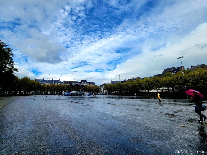 突然下起了大雨,趕緊跑進拱廊下躲雨,但風又大又冷...