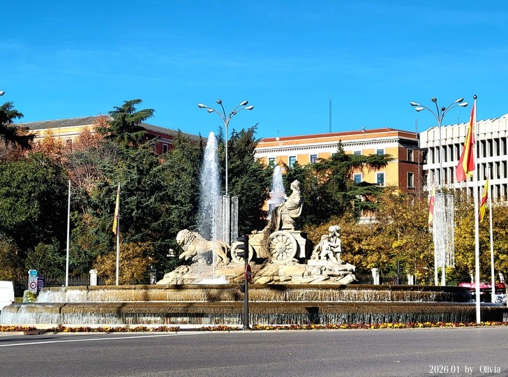 ▲西貝萊斯噴泉描繪弗里吉亞生育女神西貝萊斯,坐在兩隻獅子拉著的戰車上。噴泉興建於卡洛斯三世時期,由文圖拉·羅德里格斯設計於1777年到1782年之間。女神和戰車是弗朗西斯科·古鐵雷斯的作品,而獅子是羅伯特·米歇爾的作品。 |