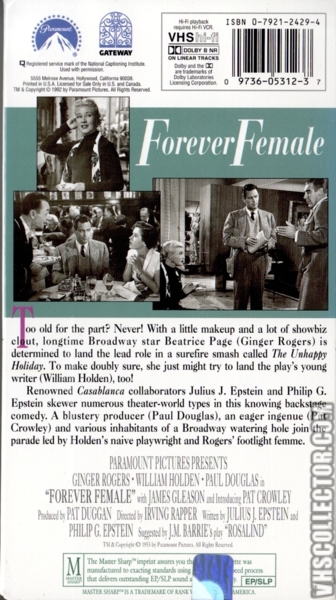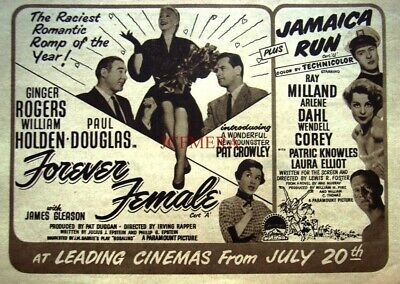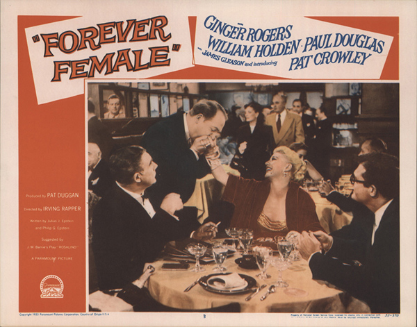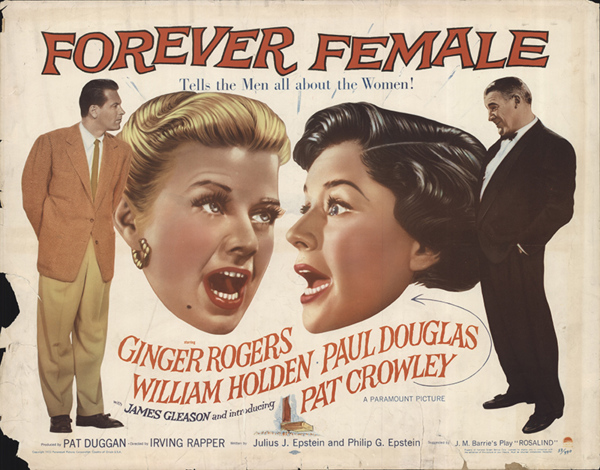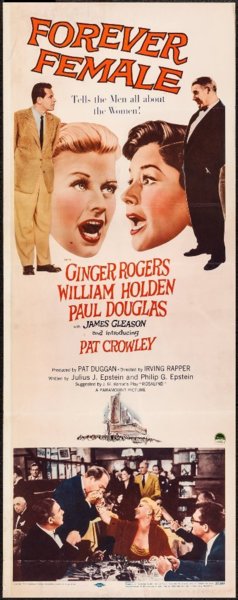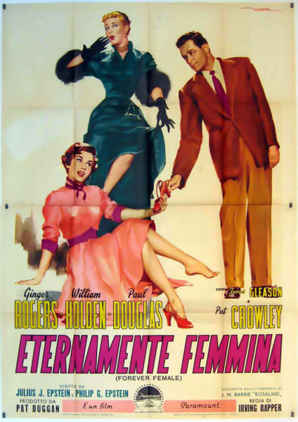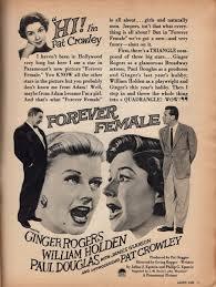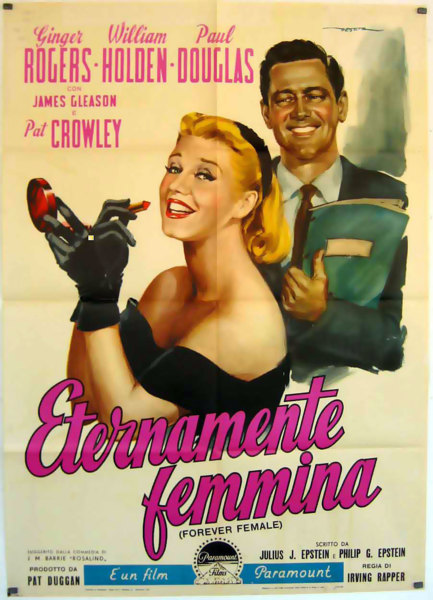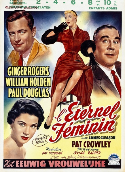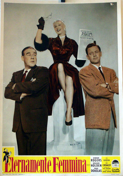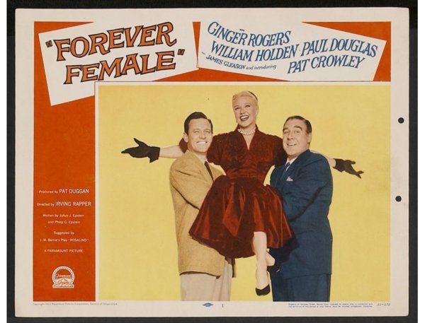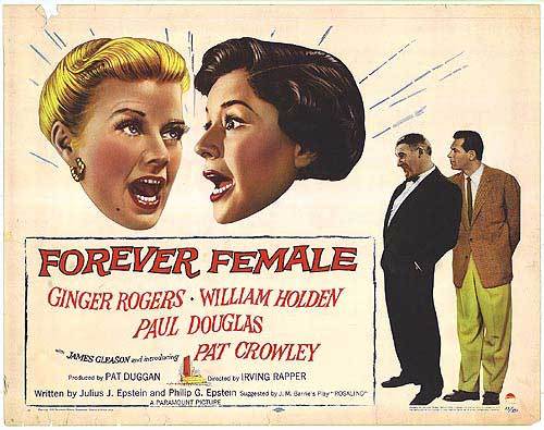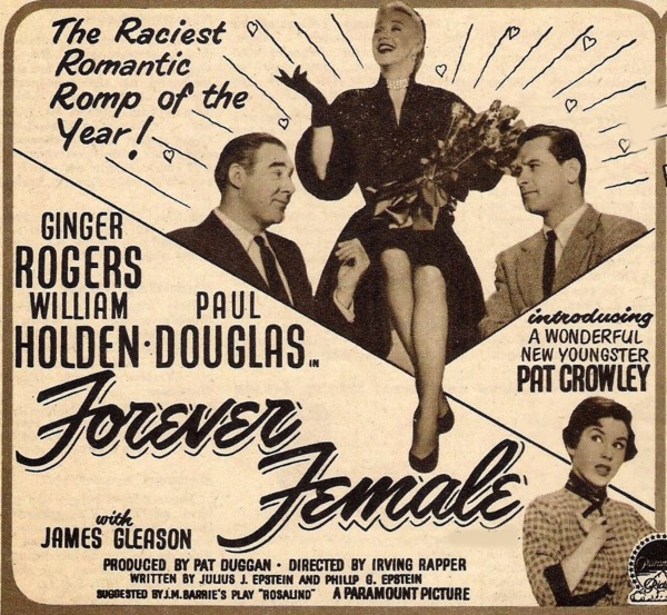 下部電影是派拉蒙的[Forever Female/永遠的女性]. 這部電影最初被稱為[Rosalind/羅莎琳],然後是[Reaching for the Stars/伸手可及的星星]。 這部演藝圈喜劇片根據英國蘇格蘭作家J.M. Barrie的舞臺劇[Rosalind], 原本劇情是是1912年“遠離倫敦”的一個小鄉村寄宿公寓, 一位著名女演員精心偽裝成邋遢的中年人,為了逃避崇拜者和她在大都市瘋狂的名人生活方式。 Julius J. Epstein&Philip G. Epstein兄弟改編電影劇本將舞臺劇大改: 琴姐飾演一位資深百老匯明星碧翠絲Beatrice Page,選擇了史坦利Stanley Krown(威廉荷頓)的劇本──主角為一個母親和19歲女兒. 已過40的碧翠絲想扮演女兒。19歲可能太勉強,但相信她可以演出29歲,因此希望重寫劇本。她也對史坦利表現出情感上的興趣。 製片人保羅道格拉斯——他也恰好是羅傑斯的丈夫——堅持史坦利改變主角的年齡。 一位年輕女演員(Pat Crowley)首先稱自己為莎莉Sally Carver,然後是 Peggy Pruitt 想要試鏡。 史坦利讓她在他的重寫稿上打字,嫉妒的碧翠絲在城外給她找了一份表演工作。 史坦利在華盛頓特區的戲劇預演和失敗。 莎莉──現在稱自己為Clara Mootz,試圖說服史坦利,碧翠絲太老了,不適合女兒角色。 史坦利在一個小鎮上看到這齣戲──由莎莉領銜主演──現在以她真名Clara Mootz──相信她是對的。 碧翠絲最終承認,是該讓她展現實際年齡的時候了,她同意扮演母親的角色. 這齣戲在百老匯大獲成功。