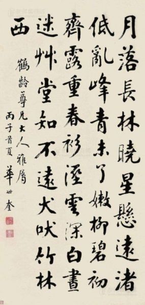 華世奎(1863—1942),字啓臣,號璧臣、思闇、北海逸民,祖籍江蘇無錫,後遷避於天津,著名書法家,天津“八大家”之一。 又與華世奎、孟廣慧、趙元禮並稱近代天津書法四大家,居四大之首──一方面是華的書法造詣出類拔萃。另一方面華曾任八旗官學教習,是清朝賞加二品頂帶的大臣,可謂官高爵顯。 華世奎的書法,真、草、隸、篆諸體,無有不精。 書法走筆取顏字之骨,氣魄雄偉,骨力開張,功力甚厚。 而最能代表其書法風格的要算他的楷書作品,走筆取顏字之骨,骨力開張,功力甚厚,有館閣氣魄。 手書的“天津勸業場”五字巨匾,字大1米,蒼勁雄偉,是其代表作。被官方定為中華歷代名匾。 書法作品小至蠅頭小楷,大至徑尺以上榜書,結構都很凝重舒放,晚年更加蒼勁挺拔。 華世奎作為名書法家,訂有“筆單”,往年天津各南紙局多代收書件。 華世奎經過長期的書法實踐和探索,將蘇東坡的巧結構和篆隸的筆法與顏的拙字相結合,形成了拙巧相間的“華體”書法;而且在理論上總結出了富於自己個性內涵的六種筆法,即“提、按、頓、挫、內顫、外顫”。 他為人寫了許多牌匾和碑記、墓誌銘等,在天津留下了不少可資紀念的文物。 著有《思闇詩集》留世。他的書法作品也被各美術出版社相繼出版,如《津門華世奎孝經帖》等等。 參考/引用資料: