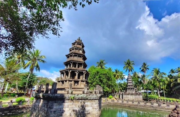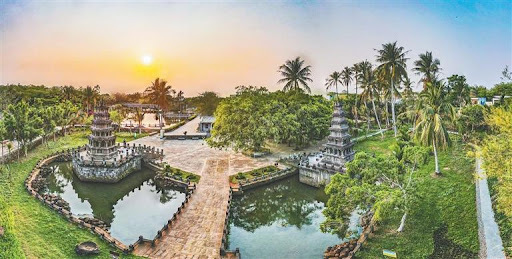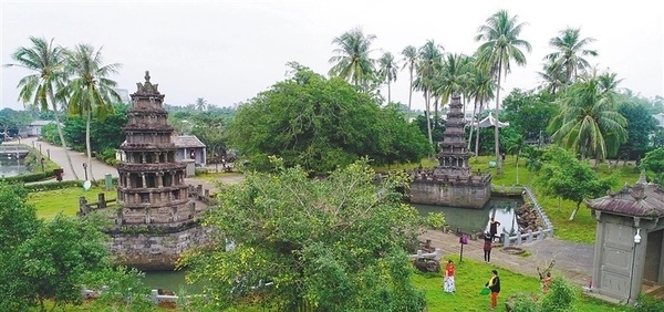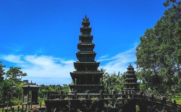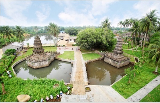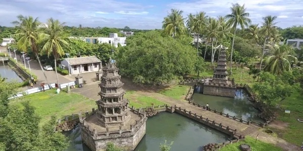 美榔雙塔,古稱“買榔二塔”“美榔二塔”,俗稱“姐妹塔”,位於海南省澄邁縣金江鎮美榔村, 是海南省現存古塔中興建時代最早一座石佛塔. 根據明代正德《瓊台志》:“輯瑞庵,在縣南四十里王家都,元建。鄉人陳道敘為次女尼善長施田於庵。安撫使謝圖南扁名。” 「買榔二塔,在輯瑞庵前左右深田中。元鄉人陳道敘有二女,長靈照適人,次善長出家居庵。道敘為捐錢一千緹建立此塔,高五丈餘,層簷七級。 不過後人考證,雙塔應建於南宋末年。 美榔雙塔修建於一泉池之旁,約呈東西向並排而立。 姐塔在南,妹塔在北。雙塔都是用玄武岩石條幹擺建築而成,為仿木結構空簡樓閣式的佛塔, 美榔雙塔相距20米,全身用當地馬鞍山火山玄武岩建造。 因塔建於池水中,故台基高大,並以懸臂梁連接台基頂面,台基及懸臂梁週設護欄。 姐塔為六角六層仿木構樓閣式塔,坐東南向西北,通高13.06公尺。 台基高4.41米,週長31.4米。塔基雙層。 塔身第一至第三層每層簷下有12根柱,自第四層起,各層外壁隱出半圓倚柱。 塔身上飾有供養人雕像。