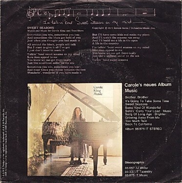 首支單曲是[Sweet Seasons/甜蜜季節], 由金與Toni Stern創作,Lou Adler製作成一首融合軟式搖滾,民謠搖滾與白人靈魂的歌曲, 在流暢的節奏間,卡洛以她自然的嗓音平實演繹. 《Cash Box》雜誌將其描述為「明亮而輕鬆」的「鋼琴重擊器」。 [Sweet Seasons/甜蜜季節]登上美國告示牌單曲榜#9,為金第三次封Top20熱門曲. 美國《Cash Box》雜誌單曲榜#8. 副榜──Easy Listening榜亞軍. 加拿大#12,澳洲(GS)#19,澳洲(KMR)#23.