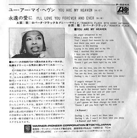 美國靈魂爵士歌姬蘿貝塔弗萊克(Roberta Flack,1937-)跟黑人歌手唐尼海瑟威(Donny Hathaway,1945-1979)在70年代合作多次. 除1972年出過一張合唱專輯(百萬金唱片),唱出百萬單曲〔Where Is the Love〕(#5) 1978年又唱出亞軍百萬經典〔The Closer I Get To You〕 1978年底,,蘿貝塔與唐尼開始籌備另一張合唱專輯 1979年1月,唐恩卻從下榻飯店第15樓臥室跳樓自殺,得年33歲 弗萊克傷心的努力完成專輯. 1980年3月,這張名為〔Roberta Flack featuring Donny Hathaway〕的大碟終於由Atlantic唱片公司發行,收錄七首歌──包括兩首唐尼的合唱曲. 專輯由蘿貝塔弗萊克&Eric Mercury, Arif Mardin, Joe Ferla製作,評價良好. 登上美國告示牌專輯榜#25(靈魂榜#4), 副榜──靈魂專輯榜#4,爵士專輯榜#9 拿到金唱片(50萬張+) 英國#31 1979年11月,42歲半的弗萊克推出大碟首支主打[You Are My Heaven/你是我的天堂],與唐尼海瑟威合唱, 此曲由Eric Mercury, 史提夫汪達(Stevie Wonder)創作, 弗萊克版是獨唱單曲,蘿貝塔弗萊克&Eric Mercury製作成一首靈魂放克/迪斯可. 節奏輕快,律動感十足,蘿貝塔與唐尼的搭配和諧無間. [You Are Everything]登上美國單曲榜#47, 副榜──靈魂單曲榜#8.成人當代榜#46, Cashbox單曲榜#78