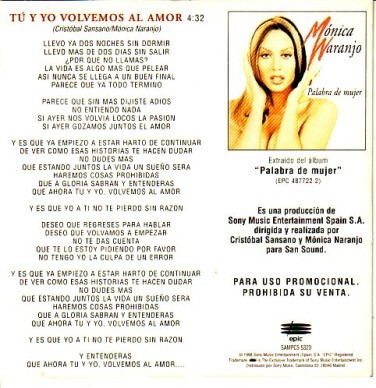 1998年6月,納蘭霍推出大碟第七單曲──也是第三宣傳單曲[Tú y yo volvemos al amor/你我重回愛情], 由 Mónica Naranjo 和 Cristóbal Sansano 創作, Cristóbal Sansano製作成一首拉丁流行/民謠抒情曲, 編曲簡潔,旋律悅耳,節奏輕快,莫妮卡的演繹感性激昂兼具. 2008年,美國二人組Ha Ash翻唱這首歌的一個版本,收錄在他們的第三張專輯《Double Room》中.