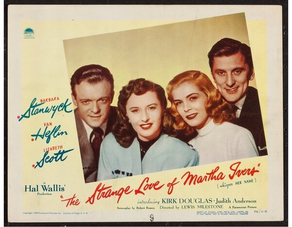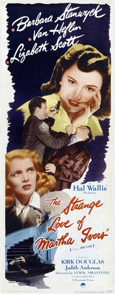 接下來,芭芭拉又主演另一部名片[The Strange Love of Martha Ivers/瑪莎艾弗斯的奇異愛情]. 這部黑色電影劇情片根據劇作家John Patrick.的短篇小說《Love Lies Bleeding愛》。 Robert Rossen以35,000美元的價格獲得小說版權。 由他和未掛名 Robert Riskin改編劇本. 講述兒時好友瑪莎、華特和山姆分享著一個可怕的秘密。 隨著時間的推移,雄心勃勃的瑪莎和膽怯的華特結婚了。 她是個冷酷的女商人;他是地方檢察官:這是一個完美的組合,可以隨意統治腐敗的艾弗斯敦市。 但山姆在闊別多年後意外回歸,讓這對令人敬畏的夫婦深感不安。