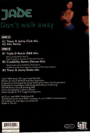 1992年11月,美國女子團體翡翠(Jade)推出的首張大碟[Jade to the Max/金玉滿堂](Giant/Reprise唱片發行) ,由Vassal Benford,Ron Spearman,Alton "Wokie" Stewart製作,評價中等. 首支單曲[I Wanna Love You]登上美國告示牌單曲榜#16 副榜──R&B榜#7,英國榜#13,打出名氣. 1992年11月,翡翠推出第二主打[Dont Walk Away/別走開]. 由Vassal Benford, Ronald Spearman創作 並採樣Kool & the Gang樂團1975年歌曲[Jungle Jazz]的鼓點,以及史提夫汪達(Stevie Wonder)1982年歌曲[That Girl]的和弦進程。 Vassal Benford製作成一首New Jack Swing/R&B, 旋律悅耳,節奏搖曳,歌聲層次分明. 《AllMusic》的 William Cooper認為這首歌“極具感染力,令人無法抗拒”,並補充說“它成功多年後,可能還會在電台上聽到一首熟悉的曲子”。