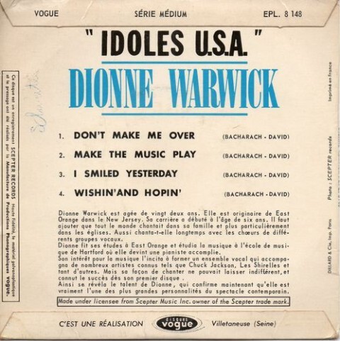 1940年12月生於紐澤西州的狄昂.華薇克(Dionne Warwick)是美國非裔歌姬紅星.原名Marie Dionne Warrick. 妹妹是歌手Dee Dee Warwick,阿姨是西西休斯頓(Cissy Houston),表妹世惠妮休斯頓(Whitney Houston) 1961年夏天,她在Drifters樂團錄製熱門歌曲[Mexican Divorce]時擔任背景歌手,結識了Burt Bacharach, Hal David搭檔。 1962年10月.將滿22歲的狄昂.華薇克推出個人首支單曲[Dont Make Me Over/別讓我改變](Scepter出版) 由導師Burt Bacharach, Hal David創作,並製作成一首流行靈魂/Brill Building Pop 旋律溫柔,狄昂的唱腔從輕吟到激昂,展現其醇厚的嗓音. 起初,華薇克錄製了[Make It Easy on Yourself]原始樣本,她本想將其作為個人首支單曲發行,但唱片公司已將它給另一位藝人Jerry Butler。 因此只能選擇[Dont Make Me Over/別讓我改變] [Dont Make Me Over/別讓我改變]登上美國Billboard單曲榜#21 副榜──R&B單曲榜#5 加拿大#38 法國#69 此曲讓華薇克開始受人矚目. 後來被許多藝人翻唱,成為狄昂的招牌曲之一. [Dont Make Me Over]收在1963年2月推出,狄昂的首張大碟[Presenting Dionne Warwick],由Burt Bacharach, Hal David製作. 未入美國Billboard專輯榜,但拿到英國專輯榜#14