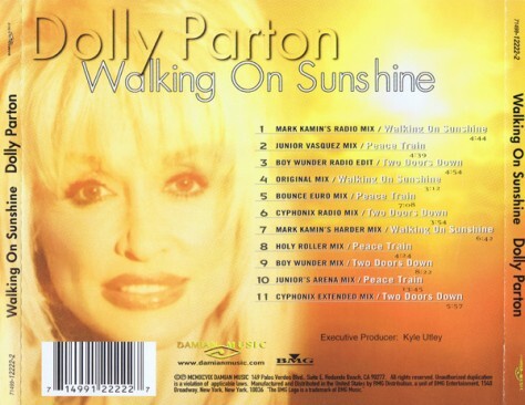 1996年9月,50歲半的美國鄉村樂波霸天后桃莉.芭頓(Dolly Parton)發行第34張大碟[Treasures/寶藏](Blue Eye/Rising Tide唱片出版) 由Steve Buckingham製作 翻唱1960-80年代的鄉村樂/搖滾樂名曲 樂評中等 商業反應則不佳 只拿到Billboard專輯榜#122 副榜-鄉村榜#21 由於1997年第二主打[Peace Train/和平列車]在舞曲界的相對熱門, 1999年8月,唱片公司將[Walking on Sunshine/漫步陽光下]的混音版以第三主打推出. 這是翻唱英國卡崔娜和海浪(Katrina and the Waves)1985年的名曲(UK#8,US#9) 由Kimberley Rew創作, Steve Buckingham將其製作成一首鄉村搖擺樂,節奏輕快討好,桃莉的嗓音扎實有力. 混音版則被製作成一首House/流行舞曲,節拍急速. 只是[Walking on Sunshine]反應不如[Peace Train],並未上榜.