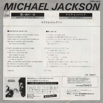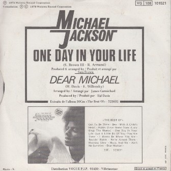 One day in your life When you find that youre always lonely For the love we used to share Just call my name, and Ill be there 1975年1月,16歲的美國少年歌手麥可傑克森推出第四章個人大碟[Forever, Michael/永遠麥可](Motown唱片發行) 收錄[One Day in Your Life/你生命中的一天],但未發行單曲. 1979/80年,麥可以第五張專輯[Off the Wall](Epic/CBS唱片發行)暢銷, 當時麥可已跳槽Epic/CBS唱片. 1981年3月,摩城(Motown)唱片趁機推出合輯[One Day in Your Life/你生命中的一天],以撈取快錢。 收錄傑克森個人和傑克森五兄弟(Jackson 5)在摩城唱片錄製的歌曲, 專輯中的歌曲大多來自傑克森的專輯[Forever, Michael] 合輯[One Day in Your Life/你生命中的一天]登上美國專輯榜#144.英國榜#29. 同名歌曲[One Day in Your Life/你生命中的一天]首支主打, 由Sam Brown III+Renée Armand創作, 1976年Johnny Mathis最先發行單曲. Sam Brown製作成一首流行靈魂抒情曲, 編曲精緻,傑克森娓娓演繹. 16歲的麥可正處在變聲時期,嗓音和兒童和成人時代有些許差異. [One Day in Your Life]登上美國告示牌單曲榜#55,副榜──靈魂歌曲榜#42,成人當代榜#37 不過在英國榜大受歡迎,登上單曲榜冠軍,認證金唱片(79萬張-已達白金唱片標準)(1981年榜#6) 荷蘭#1+2(1981年榜#6+27).比利時#1(1981年榜#2).愛爾蘭冠軍. 澳洲#9(1982年榜#53).