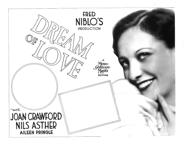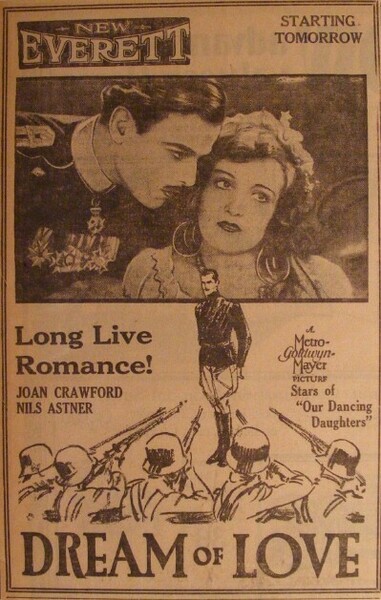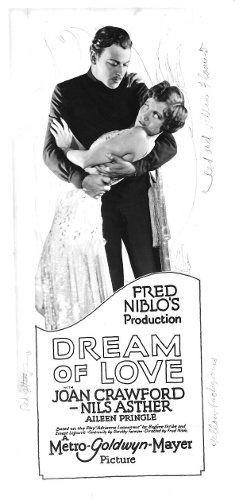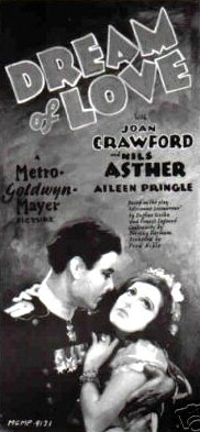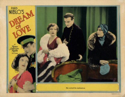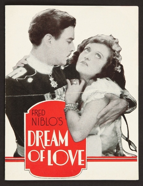 下部電影是[Dream of Love/愛之夢/佳期如夢]. 自從Elinor Glyn的小說《Three Weeks/三星期》和George Barr McCutcheons的《Beverly of Graustar》被改編成電影並大獲成功以來,這種以華麗歐洲為背景的魯里塔尼亞貴族與平民之間的愛情故事就深受美國電影觀眾喜愛。 米高梅公司試圖透過[Dream of Love]走同樣的方向.