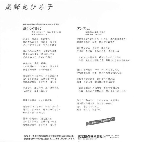 1989年1月25,24歲半的日本演藝巨星藥師丸博子推出第12首單曲 [語りつぐ愛に/愛繼續說話](東芝EMI發行). 由来生悅子(来生えつこ)作詞,来生隆夫(来生たかお)作曲 武部聡志編曲, 這是博子繼出道曲《セーラー服と機関銃/水手服與機關槍》之後,再度灌錄由来生悅子+来生隆夫姊弟二人組創作的單曲。 據来生悅子所說,這首歌的靈感來自村上春樹小說《挪威的森林》封面上的文字。 歌詞中使用的「悲しめ/悲傷」一詞正是来生悅子原創。 此曲被製作成一首中板流行曲,在流暢的節奏間,博子以溫柔純熟的唱腔演繹. [語りつぐ愛に/愛繼續說話]登上Oricon單曲榜#6. 停留16週,榜上銷量達15.8萬張。 名列1989年日本最暢銷單曲#55。 這首歌最初收錄於来生隆夫的專輯《With Time》(發行於1988年11月25日), 藥師丸版成功後,来生隆夫於1989年4月12日將自己的版本推出單曲,只是未入榜.
