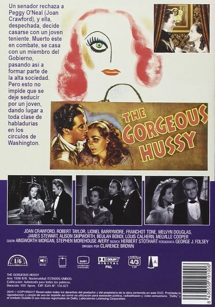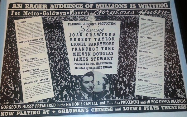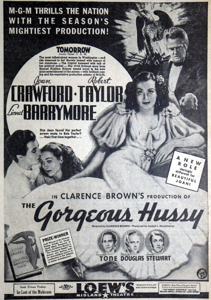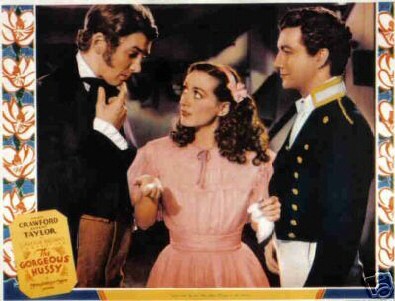 想想[The Gorgeous Hussy]中的佩姬.歐尼爾.伊頓吧,這部電影昨天在米高梅的鼎力支持下進入國會大廈劇院。 她之所以被稱為“酒館佩格”,是因為她的父親是酒館老闆,而她則成為對安德魯傑克遜政府如同女兒般的Mlle. Maintenon小姐。 她有過幾次婚姻,擁有許多追求者,並且深受傑克遜先生的青睞。 華盛頓的女士們在社交方面不認可她,而華盛頓的男士們則在政治方面向她獻殷勤。 她活潑、聰明,超出婦女享有選舉權的時代之前。 傑克遜總統因為她解散內閣,男人為她犧牲,最終她搬到西班牙並與19歲的舞蹈教練結婚。