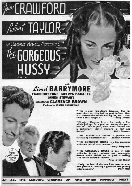 Metro和Samuel Hopkins Adams的故事有一部分符合歷史事實,但大部分內容聽起來難以置信,劇中演員的政治或情感論點也缺乏說服力。 歷史迫使我們接受佩姬伊頓對維護傑克遜式民主的真正貢獻, 我們的民族自豪感卻無法抵禦必須感謝克勞馥小姐為克利夫蘭先生、威爾遜先生和羅斯福先生等恩人做出貢獻的想法。 我們拒絕承認[The Gorgeous Hussy]是事實,作為電影化的虛構作品,它只是過得去而已。