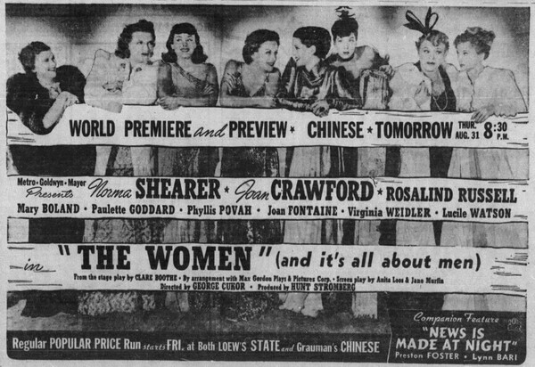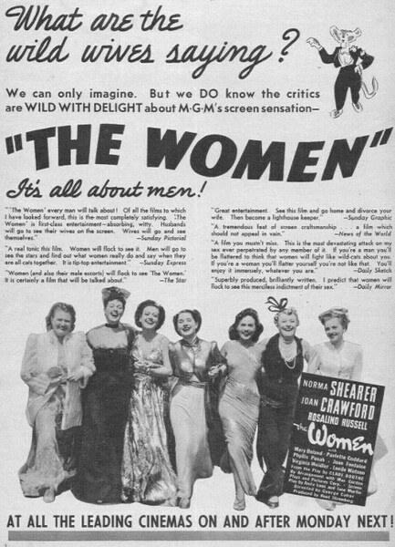 儘管MGM在1936-38年百老匯上演19個月的Clare Boothe的戲劇中添加一些諸如放錯位置的時裝秀之類的修飾,[The Women]仍然像原著一樣,尖刻而成熟地描述了美國中產階級一隅的社會衰敗。 由於演員陣容不允許用片廠戀情來宣傳這部電影,米高梅的新聞代理人並沒有阻止粉絲作家的猜測,他們認為這部電影的三位喜怒無常的明星之間有片廠糾紛… 首席女伶出於純粹的職業原因,確保自己的排名高於競爭對手首席女伶克勞馥,並規定她的名字的廣告字體應為標題的一半大,且為小明星羅素字體的兩倍大。 但是,如果這種預防措施會引起任何不滿,肥胖、嗓音尖銳的導演喬治·庫克—— 一位深諳女明星處事之道的專家 —— 就不會允許這種行為在片場發生。